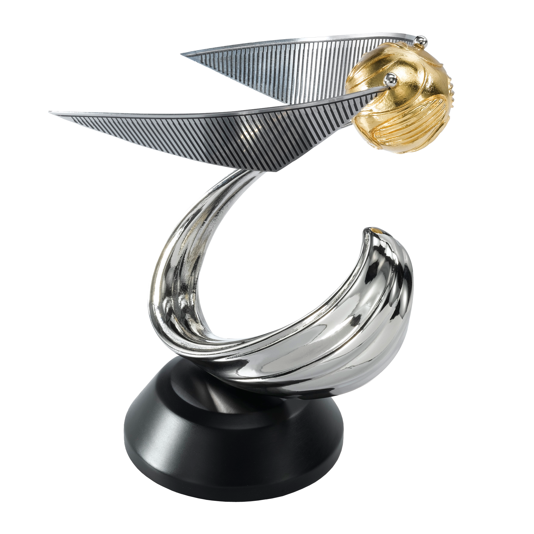 Crafted in die cast metal with silver and 24k gold plating, the Snitch is attached to a black coated wood base.